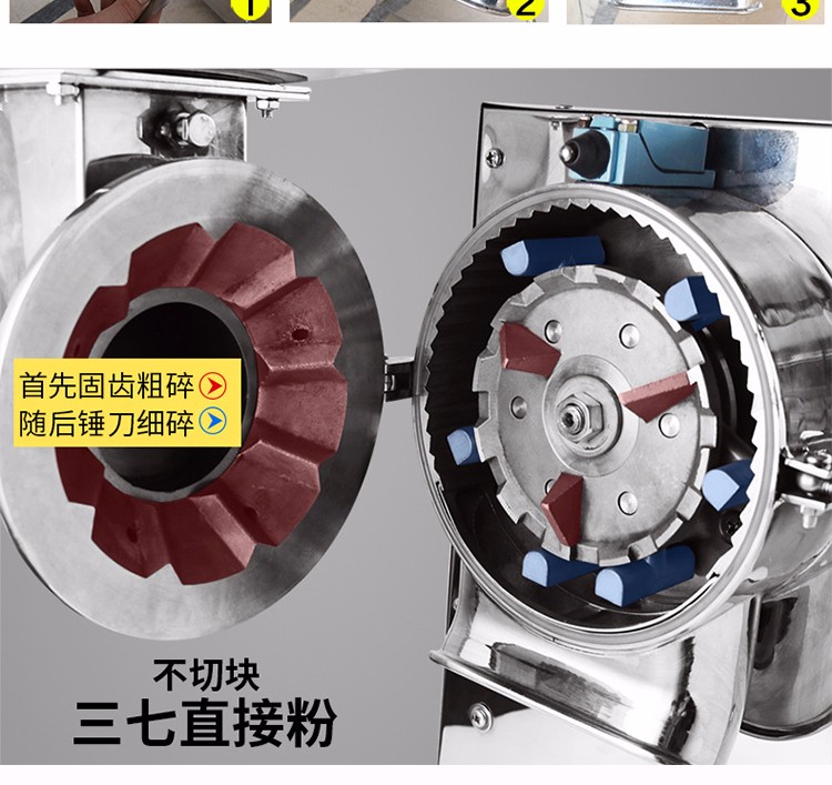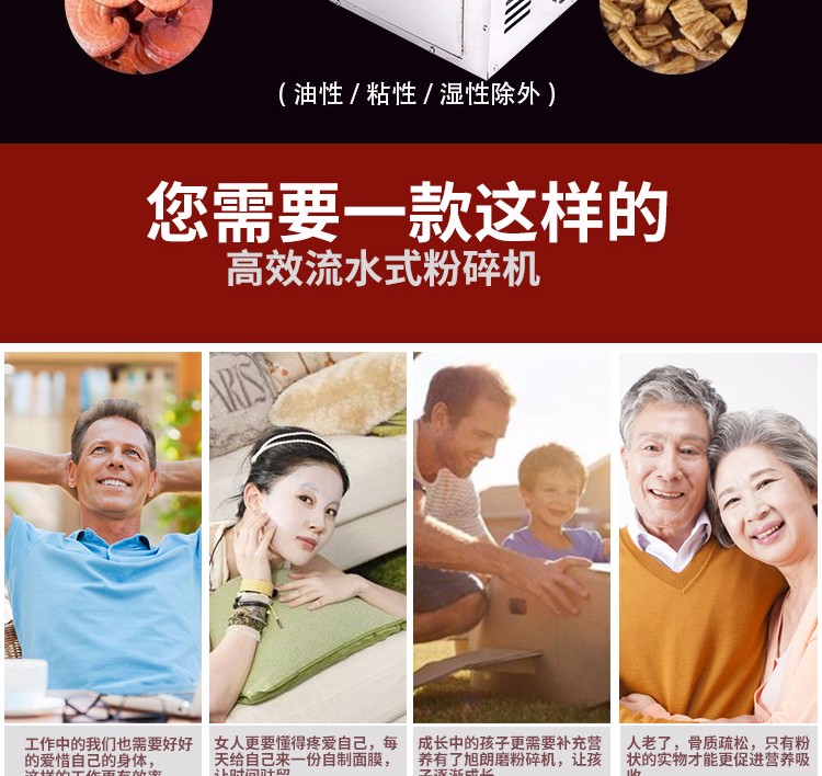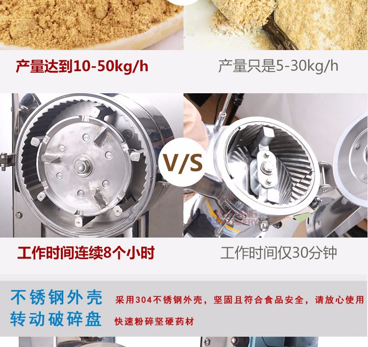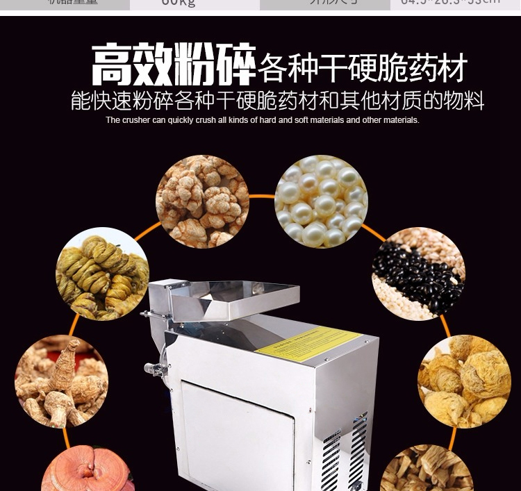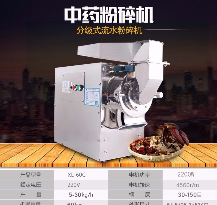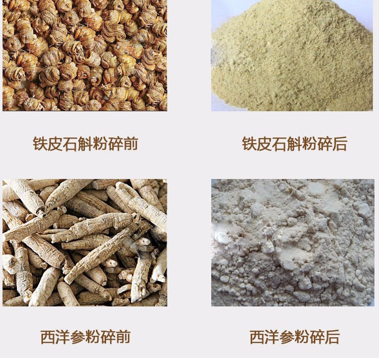 XL-60C中药粉碎机能快速粉碎各种软硬药材和其他材质的物料,主要包括灵芝、西洋参、铁皮枫斗、三七、珍珠、茎草类、矿石类、五谷杂粮、玛卡、干燥的草本植物等(油性、湿性、粘性物料除外)。注:要直接投入的块料尺寸不能大于40毫米。