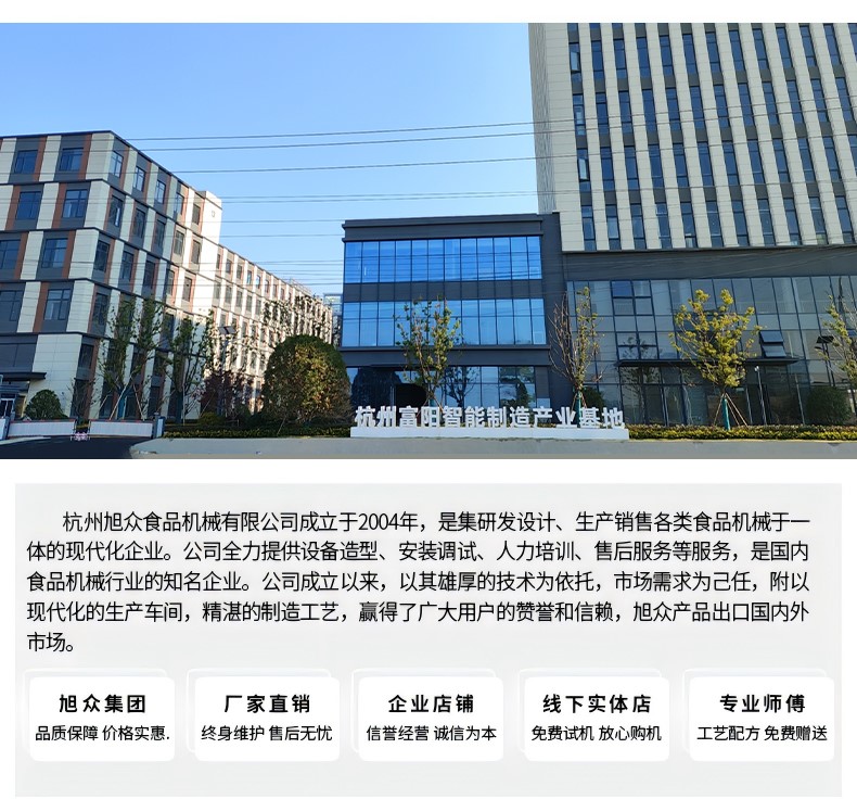杭州旭众机械设备有限公司是一家集科研开发,生产设计,营销服务为一体的现代化生产企业。现代化生产车间,精湛制造技术,所产机械历经市场重重考验,不断赢得海内外客户的赞誉。